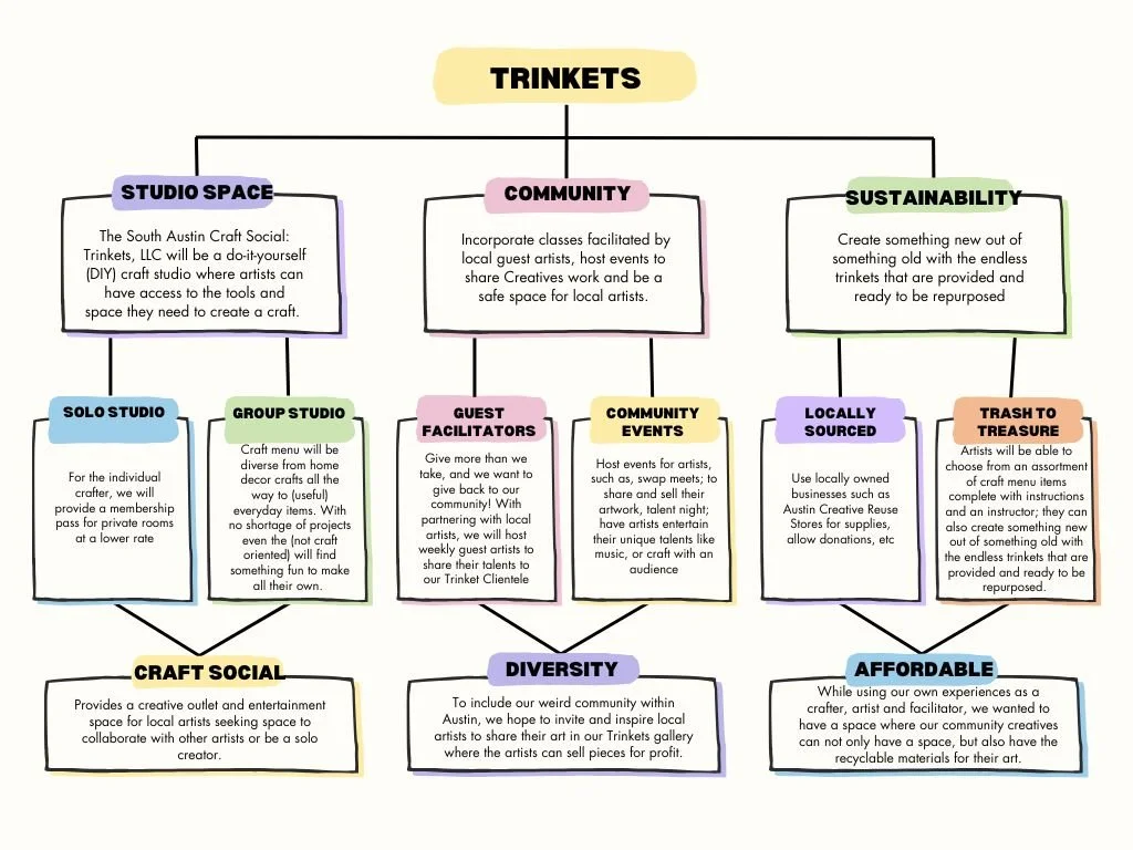 Trinkets is a DIY Craft studio that will focus on community efforts that will involve local artists to not only share their craft to Austin, but have a place dedicated to create, showcase, and build collaboration with other artists.